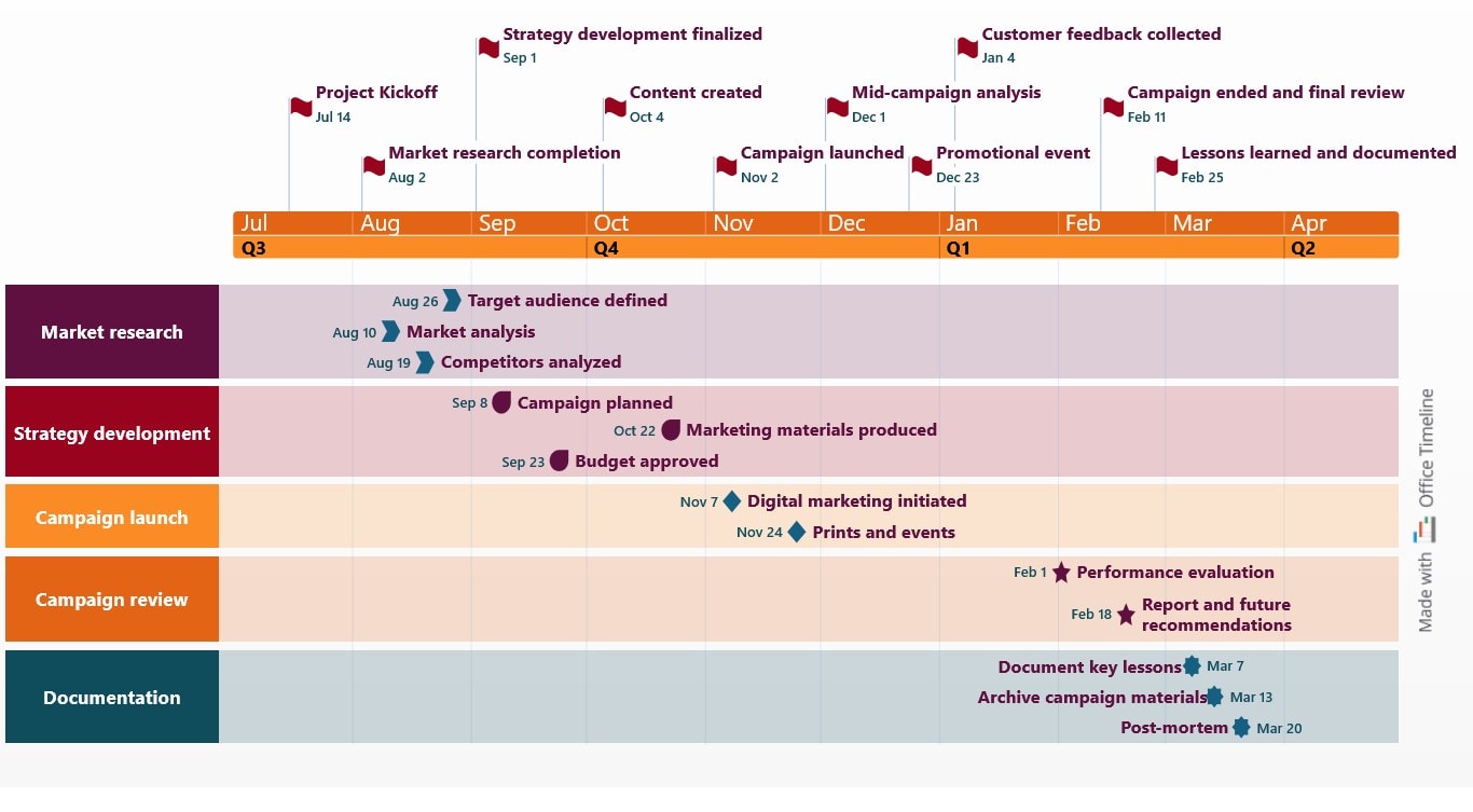 Use the Office Timeline plugin to create timelines like this one directly inside PowerPoint. You’ll save time and get consistent results, which is especially helpful for recurring reports.